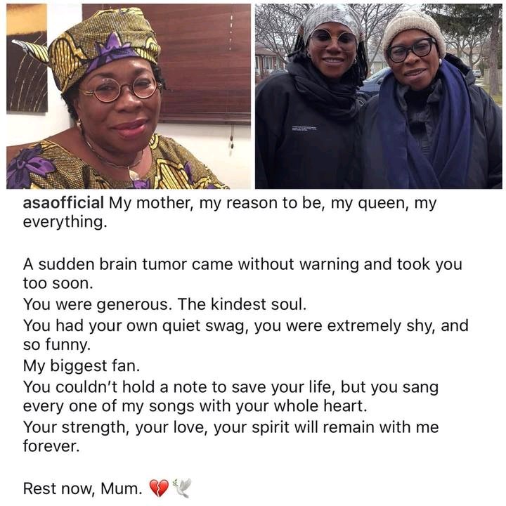 Asa’s tribute to her mother is a testament to the profound impact she had on her life and career. The singer’s heartfelt message has touched many, and her fans are sending their love and support during this difficult time.